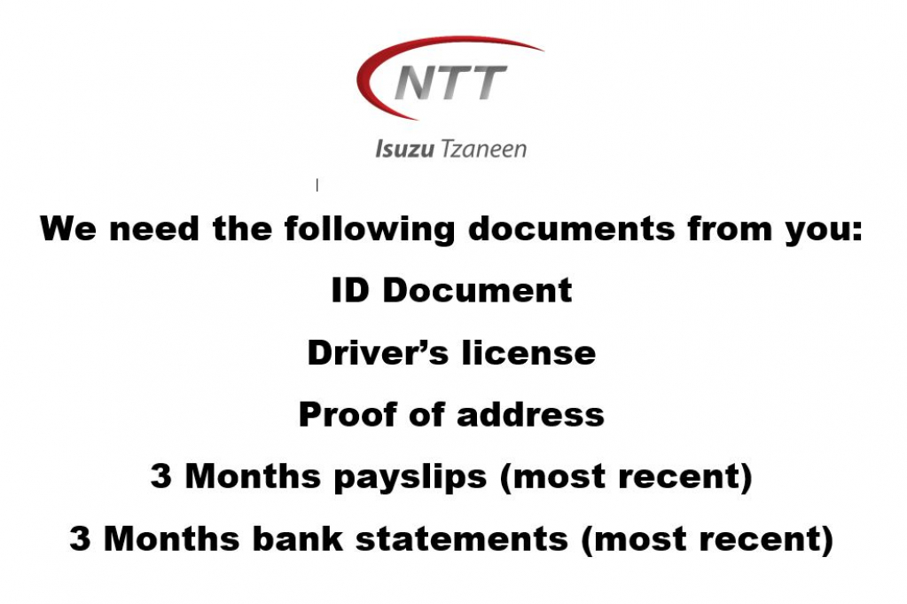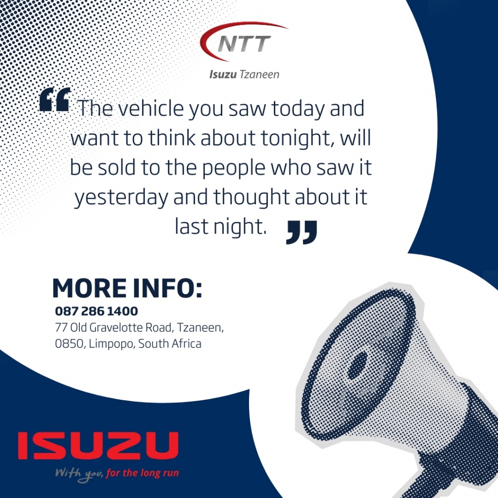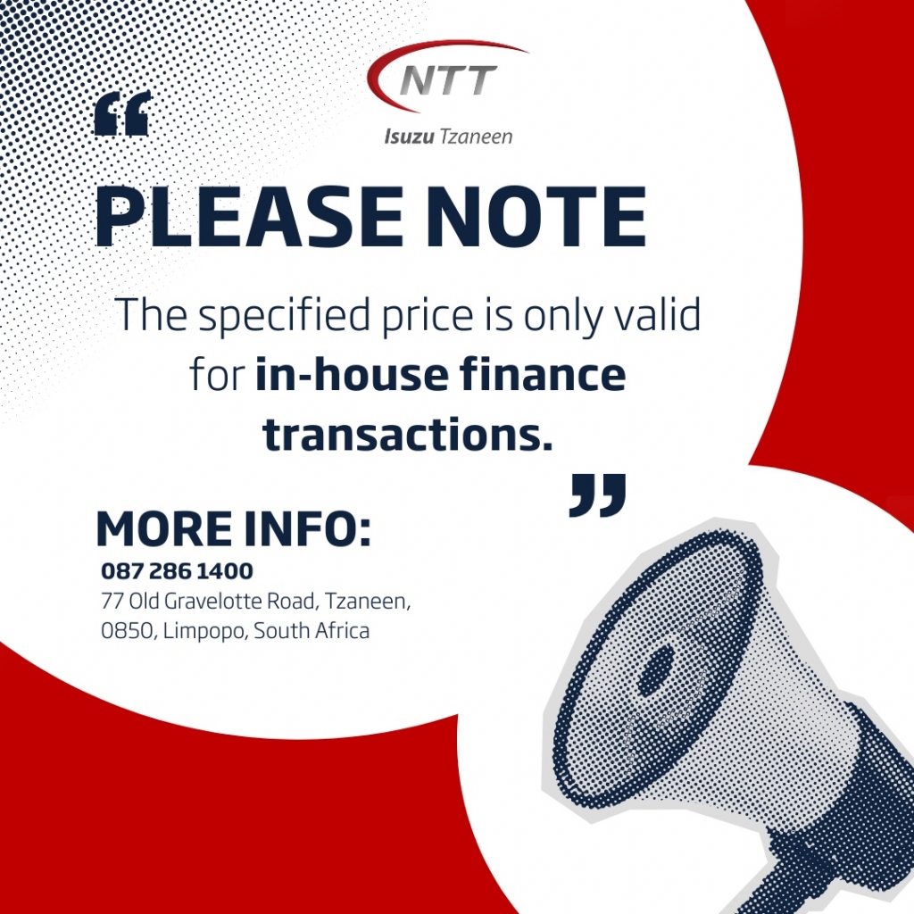 Air Conditioner, Alarm Immobiliser, Alloy Wheels, Bluetooth, Carpet Set, Cartrack, Central Locking, Electric Windows, Nudge Bar, Power Steering, Radio CD, Remainder of Service Plan, Remainder of Warranty, Reverse camera, Roll Bar, Service History, Side Steps, Tonneau Cover, Tow Bar, Window tint. NTT Isuzu Tzaneen offers nationwide delivery to all our valued customers as well as our very own finance and in insurance manager who is ready to help with finance at our dealership or over the phone for your convenience in a matter of minutes. All of our vehicles come with a 80 point check from our qualified workshop